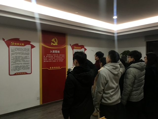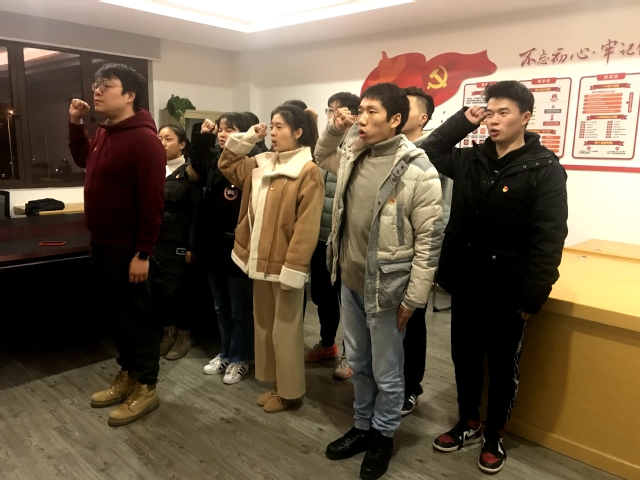 当晚,参与宣誓活动的有员工党支部的正式党员鲁绍蓉、李群,预备党员周佳骏、蒋一飞、王寅喆、李芳燕、季东雷、苗舒婷以及发展对象常正伟等9位同学。宣誓仪式在庄严的国际歌中拉开序幕,孙佳鸣代表员工党支部进行致辞,并宣读2018年第四季度发展和转正的党员名单。随后,由孙佳鸣领誓,在场全体面向宣誓墙进行庄严宣誓。宣誓后,5位新党员逐一发言,并进行表态,他们表示一定会用自己的实际行动践行许下的承诺,不忘初心,牢记使命,在今后的工作、学习、生活中展现先锋模范作用,永远跟党走。鲁绍蓉作为员工党员代表向新党员送上祝福和期望,希望他们在未来的日子里牢记自己的党员身份,展现党员的模范性。常正伟作为发展对象代表进行发言,表示将向党员同志们学习,提升自己的思想觉悟和理论素养,期盼能够早日加入党组织。最后,谭松珊对在场的全体提出几点希望,1、珍惜组织对自己的信任,要以百倍的努力践行自己的誓言;2、提高政治站位,在平时亮身份,积极发挥作用;3、牢记自己的党员身份,有所为有所不为,牢记组织的教诲。