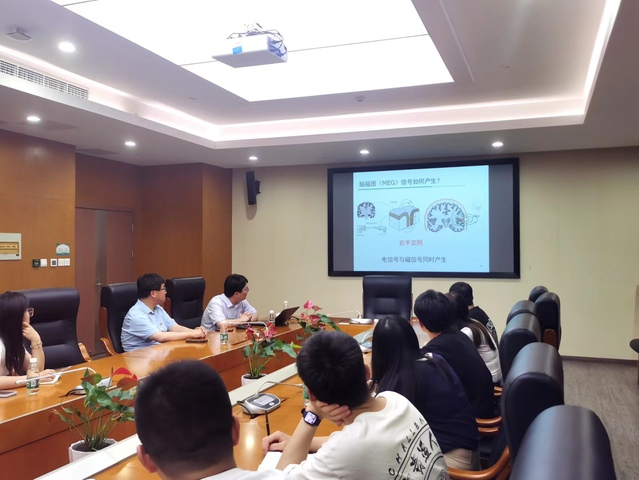 会上,胡业刚副研究员以“脑磁图源定位方法及应用”为题作专题报告,他从脑磁图信号的产生、脑磁图信号的采集以及处理等几个方面展开论述,同时针对源定位分析原理以及在临床上的应用多方位地为与会师生展示了相关的研究成果。他表示,基于脑磁图信号的空间定位方法,可以更加准确地定位脑部异常区域的位置,在临床实践上具有重要的意义。报告深入浅出,引起了师生们的浓厚兴趣。会后,与会师生针对各自感兴趣的研究热点以及在科学研究中遇到的共性问题进行了深入的交流和探讨。