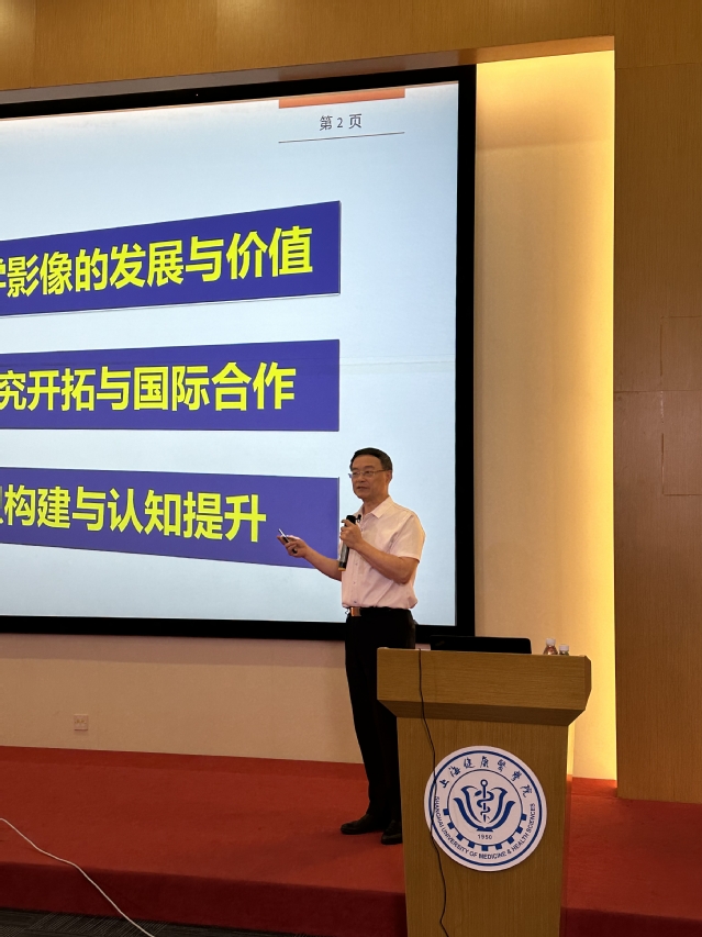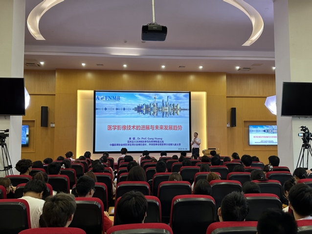 黄教授以《医学影像技术的进展与未来发展趋势》为题,分别从三个方面进行阐述:医学影像的发展与价值、研究开拓与国际合作,以及知识构建与认识提升。既有前沿知识又有基本理论,既立足当下又放眼未来,为新生全面呈现了医学影像技术的概貌,在场的同学听得津津有味,一个半小时的讲座意犹未尽。同时,黄教授结合自身经历,谈了对学习与读书的看法。他满怀殷切期望,叮嘱同学们要树立远大志向,既拥有扎实的知识,又怀有仁爱之心,做能解决实际问题的具有行业引领潜质的健康守门人。