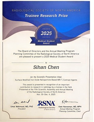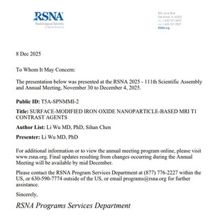 近日,国际放射学领域最高级别的学术盛会——2025年第111届北美放射学会年会(RSNA)在美国芝加哥隆重举行。本届大会以“Imaging the Individual: Precision Health through Diversity, Equity and Inclusion(聚焦个体影像:通过多元化、公平性和包容性实现精准健康)“为主题,汇聚全球智慧,共议精准健康未来,吸引了来自全球超过130个国家的5万余名学者、专家及行业代表参与,共同呈现了学科前沿动态。WilliamHill中文官网吴励副教授赴本届盛会,并作为通讯作者及团队代表,领取了“Trainee Research Prize”获奖证书,并向全球同行展示了题为《Surface-modified Iron Oxide Nanoparticles-based MRI T1 Contrast Agents》的创新研究成果。