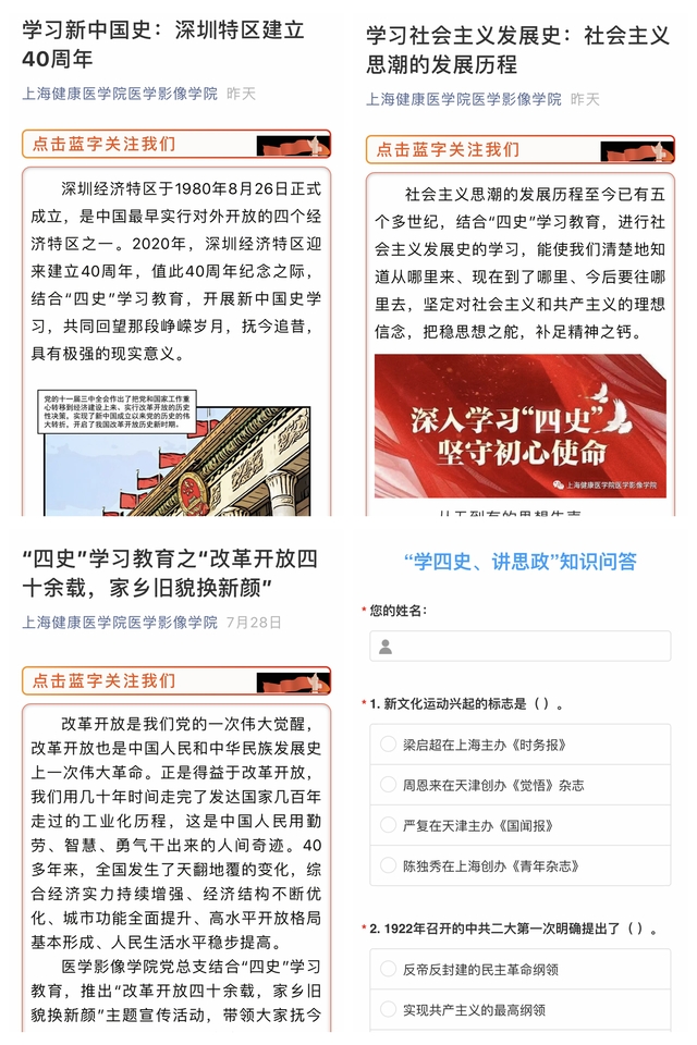 依托公司网站和微信公众号,推出“四史”学习教育之“改革开放四十余载,家乡旧貌换新颜”、“学习新中国史:深圳特区建立40周年”、“学习社会主义发展史:社会主义思想发展历程”专题宣传及“学四史、讲思政”线上知识问答,使全院教师抚今追昔,了解时代发展,感受社会变迁,通过学习党史、新中国史、改革开放史、社会主义发展史以及课程思政等相关知识,增强公司“四史”学习效果,让每一位教师感知在学习上所存在的不足,为下一阶段的“四史”学习教育奠定良好基础。