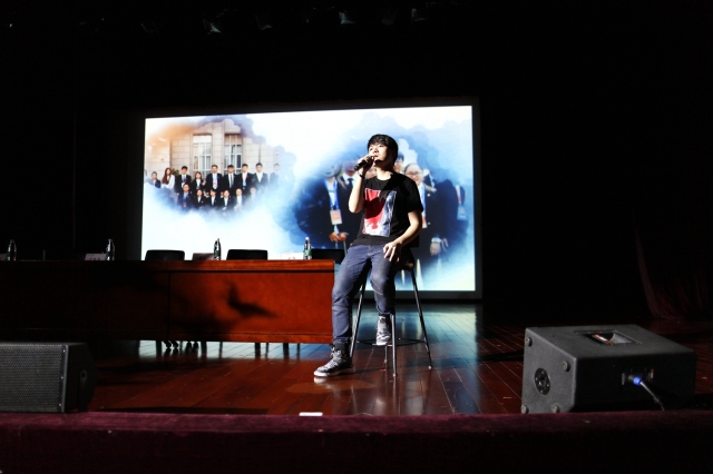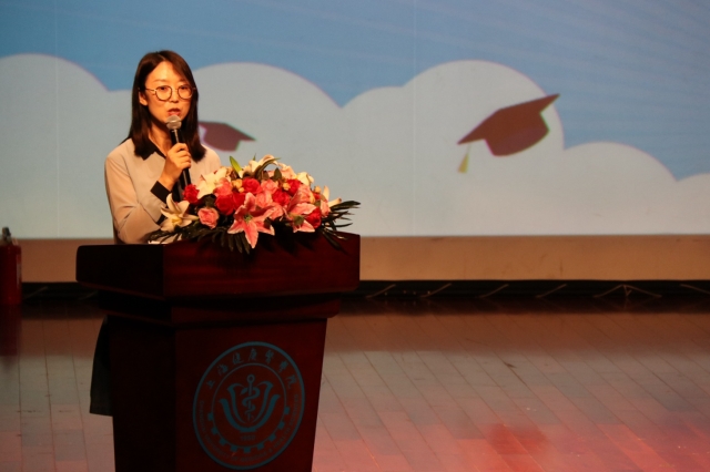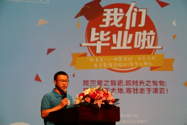 当天上午十时,随着会场灯光的徐徐暗下,毕业典礼拉开序幕。15影像1班路野驰同学作为在校生代表,为毕业生带来一曲上健医版的《成都》,“分别总是在六月,回忆是思念的愁。北苑喷泉仍依旧,鹄立实验楼后。”伴随着悠扬的歌声,大屏幕上播放着精美的视频,这部反映毕业生在校生活的短片吸引了所有人的目光,一幅幅熟悉的画面,将大家带回到过去的时光。“感恩健康,启梦远航。”同学们无不心中默念。