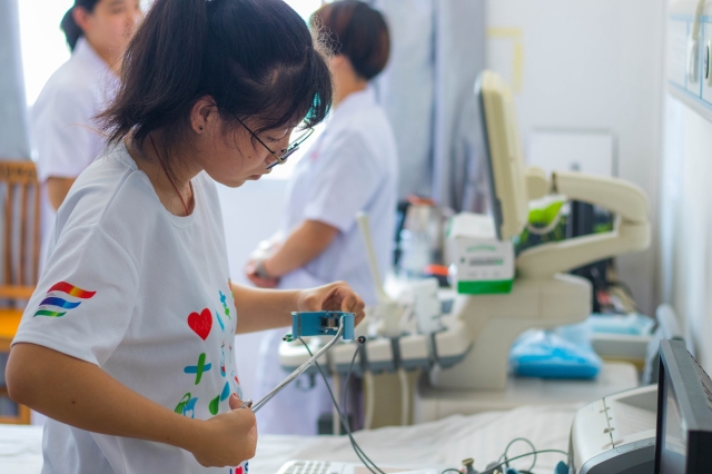 为更好地完成下乡体检任务,弘毅医疗服务队在活动的前三天于镇卫生院各科室进行轮转,开展单项操作的强化训练,同学们先后前往放射科、B超心电图室、妇幼保健中心、中医科和体检预诊台进行见习。在放射科田小杨医生向同学们介绍了DR的工作原理,在诊疗过程中进行了演示,教授大家操作技巧。在B超心电图室,周雅、严连英和丁丽丹三位医生对同学们悉心指导,使大家初步了解了超声检查的方法,熟练掌握了心电图检查的操作。在妇幼保健中心,同学们协助医生录入孕妇和婴儿的信息。在中医科,同学们了解了针灸、刮痧、推拿等中医诊疗知识。她们协助邵志勇医生调制三伏天“冬病夏治”的膏药。在体检预诊台,同学们认真地为前来医院体检的民众测量血压,踏实负责的工作态度体现了医员工担当。