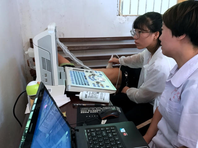 随后四天,弘毅医疗服务队分为两组跟随镇卫生院体检队开展下乡体检,每天他们迎着朝阳出发,头顶烈日归来,为当地百姓进行服务。在丰山村,因临时体检室空间狭小,负责测量血压的同学只能在室外进行工作,炙热的太阳火辣辣地烤在身上,豆大的汗珠从脸庞滑落,但她毫无怨言,默默坚守在自己的工作岗位上。山里体检场地极为简陋,B超和心电图检查只能在毫无遮掩的废弃床铺或者长桌上进行。同学们经过前几日医院的培训,已经能熟练地为村民们进行检查,一次次地弯腰,一次次地操作,即使腰酸,即使背痛,也没有人喊苦喊累。在连续多日的体检中,服务队与镇卫生院体检队分工明确,配合默契,同学们有的协助医生问诊,有的帮助护士抽血,有的负责测量血压、视力、身高和体重,有的协助技师进行B超和心电图检查,场面有条不紊,体检进行的非常顺利。