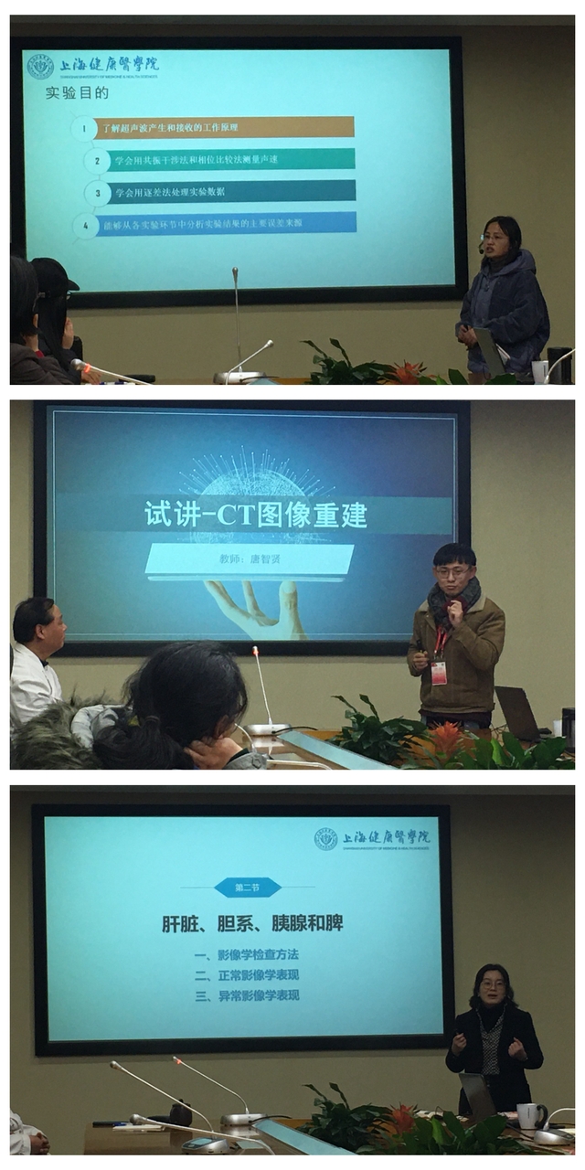 最后一位是吴励老师。她从肝脏、胆系、胰腺和脾脏的影像学检查方法、正常影像学表现和异常影像学表现讲解了《消化系统》,资深教授和影像技术教研室各位教师就影像解剖学、课件制作和教学节奏等方面展开了深入交流。