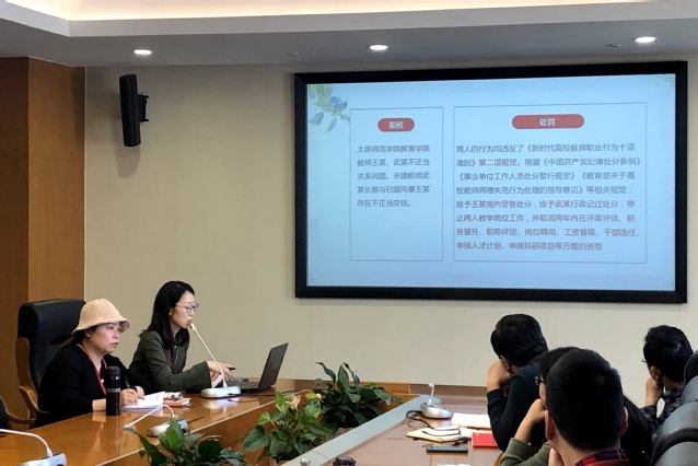 为保证本次警示教育的学习效果,会前公司提前下发学习资料,教师们在先行自学的基础上,参加全院集中学习。会上,毕昕首先为与会教师介绍了教育部公开曝光的8起违反教师职业行为十项准则典型案例,她结合《新时代高校教师职业行为十项准则》和《教育部关于高校教师师德失范行为处理的指导意见》中的具体内容进行分析,举一反三,强调了深入开展高校教师师德失范行为开展警示教育的重要性。她指出作为人民教师,必须关心爱护员工,坚持言行雅正,遵守学术规范,坚持廉洁自律,树立正确义利观,成为员工的好榜样。