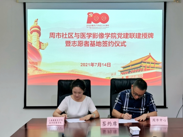 会上,刘红首先感谢周市社区一直以来给予的大力支持,今年恰逢建党100周年,双方开展党建联建具有重要意义。她介绍了党建联建的项目背景及目标,希望双方通过联建,创出特色、创出品牌、收到实效,更好地践行“学党史、办实事”理念,提升“我为群众办实事”的成效,服务社区居民和公司师生。钱国文表示从今年4月起双方已积极开展共建,在周浦镇新冠疫苗接种志愿服务过程中,公司党总支共计派出3批党员志愿者,有力地支持了本地的疫苗接种工作,取得良好社会效应,期待未来继续保持良好互动。尚淑雅就暑期社会实践活动进行了介绍,并就志愿者实践基地建设,2021年暑期志愿者活动安排进行了说明。随后,刘红和钱国文代表各自单位,进行了志愿者实践基地签约,并共同为党建与思政教育实践基地揭牌。