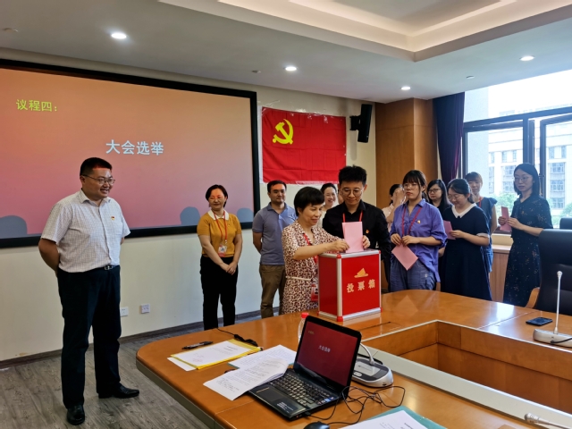 在大会选举环节,监票人谭松珊清点参加选举的正式党员人数,超过应到正式党员人数的五分之四以上,符合大会要求,选举工作正式开始。监票人谭松珊检查票箱并落锁,计票人杜文炜、周敏雄分发选票,总监票人乔慧敏向大会报告发出选票情况,监票人谭松珊宣读填写选票注意事项等流程后,全体与会正式党员井然有序地完成了投票。