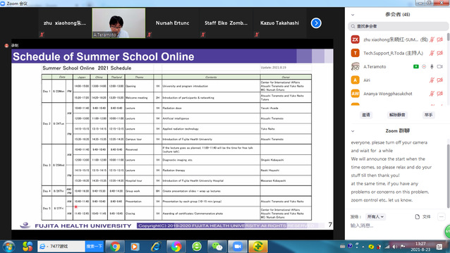 本次夏令营线上活动内容丰富,形式多样。师生相隔万里,通过网络让远程交流学习有了无限可能,通过Zoom视频会议平台、slack、微信等联络工具,实现了沟通同步。日本藤田医科大学的放射线专业教授进行了专业讲座,包括放射剂量学、AI、放射技术临床应用、医学影像诊断、放射治疗应用发展等内容,营员们进行了丰富的线上活动,形式包括小组活动讨论、作业提交、答疑、发表会、点评等活动,另外安排了线上校园观光及藤田医科大学附属医院参观活动,了解了FHU美丽的校园风景及FHU附属医院放射科工作情况,线上学习了解了日本文化,公司员工和泰国员工也向大家介绍了各自丰富多彩的公司生活,通过活动交流,增进了营员们的友谊。公司员工在活动中积极提问,发言互动,展现了我们健康学子良好的精神风貌。