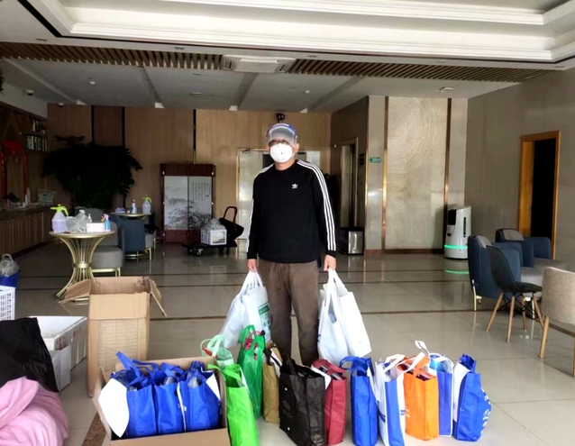4月17日,鞠老师拿到物资后,进行消杀、分包,把家里能用的袋子都找出来了,最后还细心地贴上姓名和房间号,以便确保物资顺利到达员工手中。然而,眼下的道路交通却又成了摆在面前的一道难题,面对花花绿绿十几包沉甸甸的防疫物资,鞠老师愁眉不展,所幸最后几经波折终于顺利将这一份份承载着公司领导和老师们关爱之情的防疫物资送达酒店。农历三月,气温并不很高,鞠老师忙碌奔波却已是满头大汗,他一边擦拭汗水,一边反复叮嘱:“一定要送到员工房间门口哦,注意无接触配送,一定要提醒员工再次做好消杀,静放一段时间再打开用”。