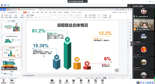 会上,党总支副书记乔慧敏从就业工作进展情况、就业工作面临的难题、目前采取的具体措施三个方面,对公司的整体就业情况进行了介绍。她表示当前疫情之下就业形势严峻,公司上下凝心聚力,精准施策,坚持一人一策,始终把就业工作作为重中之重,坚定保就业的决心和信心。毕业班辅导员从班级就业情况、近期工作、工作困难、工作计划等方面对各自班级情况进行汇报,在汇报过程中着重对未就业毕业生的求职进展进行了交流,同时就员工在就业中遇到的问题进行沟通。随后,教研室主任进行发言,表示会加强教研室研讨和责任落实,利用一切可以利用的资源,尽全力推进就业工作。