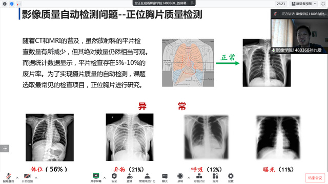 本次活动由孙九爱副教授和黄清明博士进行课题分享,孙老师以《正位胸片质量自动检测方法的研究》为题,针对医学影像摄片质量自动检测问题,采用深度学习方法对胸片中的异物和摄片体位进行自动估计。该技术能够有助于评估放射技师摄片质量,改善摄片技术规范化程度,提高检查效率,具有重要的临床应用价值和示教研究意义;黄老师则结合自己的教研经验,以《多核磁共振成像关键技术与研究进展》为题,从传统氢核磁共振成像原理和功能部件结构出发,围绕多核磁共振成像的磁体系统、射频系统、梯度系统、谱仪系统、计算机系统和超导低温保障系统等核心关键技术,以及应用该技术在人体肺部和体内钠离子检测等方面开展的相关研究进行了介绍,深入探讨了多核磁共振检查技术的临床价值、图像质量改善和扫描时间优化等方面亟待解决的科学问题。