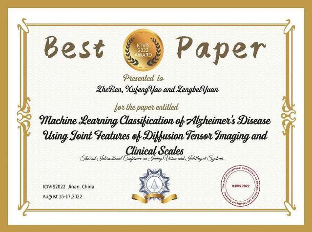 本次会议,WilliamHill中文官网教师与研究生积极参与投稿,其中研究生任哲、袁增贝同学撰写的题为《machine learning classification of Alzheimer's disease using joint features of diffusion tensor imaging and clinical scales》学术论文,被评为Best Paper Award。通过参加此次国际会议,有力促进了与各高校之间的学术交流,提升了学科专业影响力,夯实了研究生学位点建设,保障了公司产品质量。(WilliamHill中文官网)